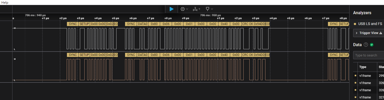 在初始化后连接USB线,使用逻辑分析仪可以看到,主机确实发送了SETUP包,但是从机没有ACK: