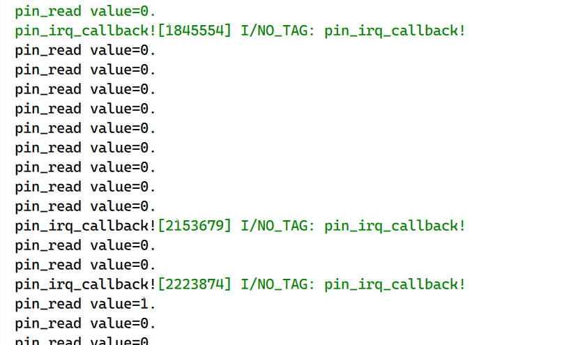 试了和你一样的代码,没有死机,能够输出pin_read value=1;但是会一直一直进入中断输出"pin_irq_callback!"。