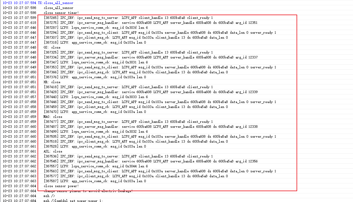 如果你想一次性关掉所有senosr,可以执行finsh命令:close_all_sensor。这个命令关掉所有sensor的供电,时钟和调度。执行效果如图: