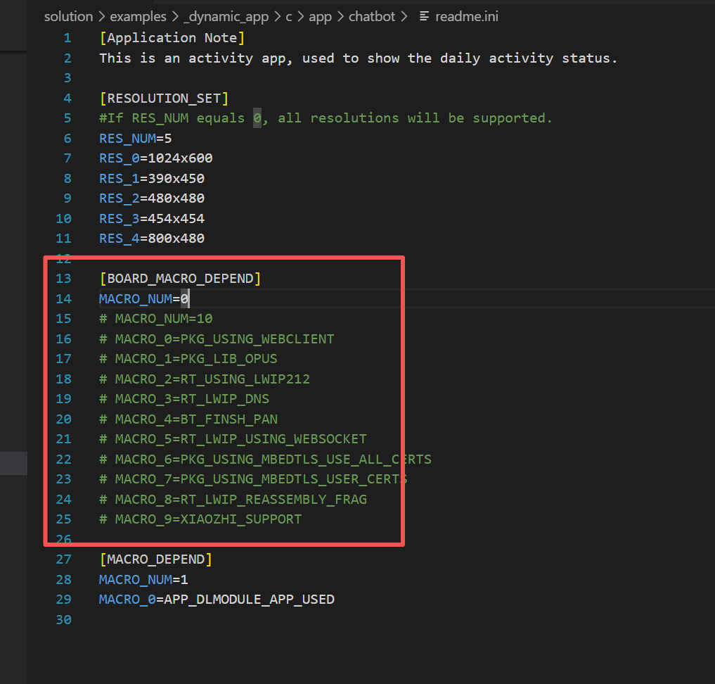 readme.ini中BOARD_MACRO_DEPEND是板级依赖,涉及到蓝牙,网络相关,模拟器上不用打开。只确认APP_DLMODULE_APP_USED是打开的应该就能正常编译模拟器(sf32lb52-ulp模拟器编译时正常应该能看到chatbot应用,理论上不需要改什么配置就能正常编译)。