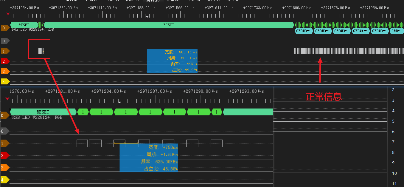 RGB灯效正常显示时,异常波形不多,如下图,就一两个高电平。