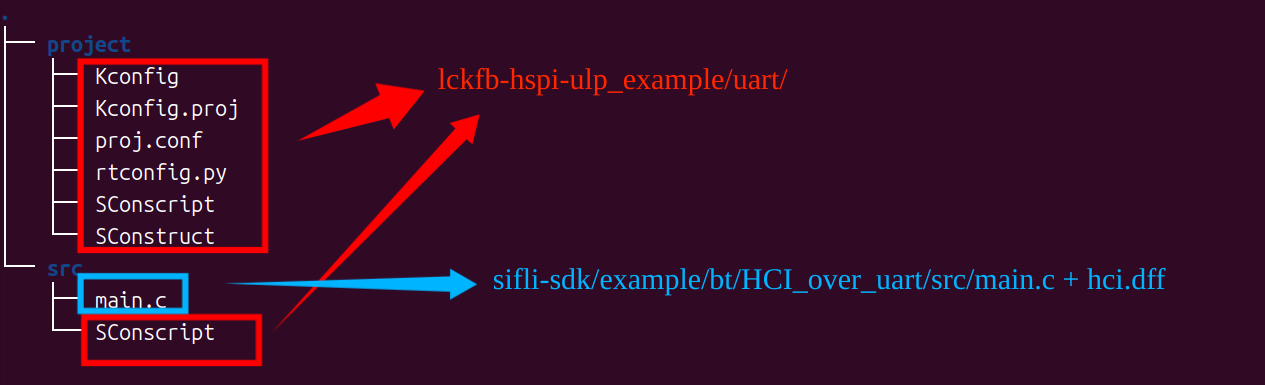 将官方HCI_over_uart/src/main.c直接覆盖立创提供的demo,覆盖proj.conf 板子可以正常启动。hci 和msh串口共用了,修改代码在uart收到任意数据都给btc发hci reset,仍然收不到hci reset的响应。基于立创提供的demo( lckfb-hspi-ulp_example/uart )进行修改得到下面工程,在uart收到任意数据,都下发hci reset。