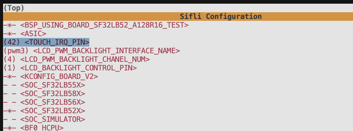 我想修改TOUCH_IRQ_PIN,但是根据文档在$SIFLI_SDK/customer/boards//sf32lb52_a128r16_test/hcpu中执行sdk.py menuconfig,无法修改引脚。