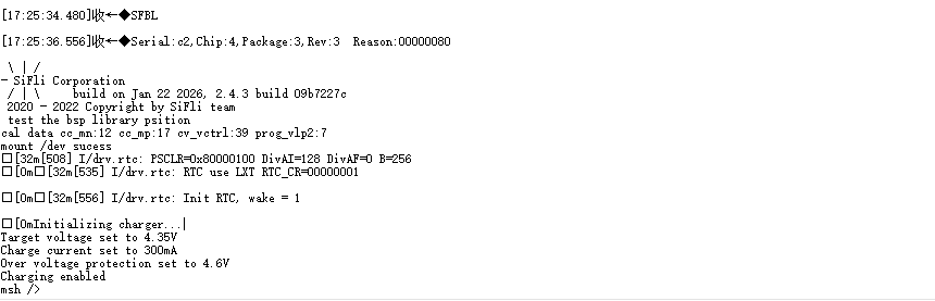 menuconfig配置充电管理模块为SF32l52自带的充电管理,按照如下方式驱动。可以设置充电电流,无法设置充满电压,到4.2v之后就充不上去了,电流降到了6mA。